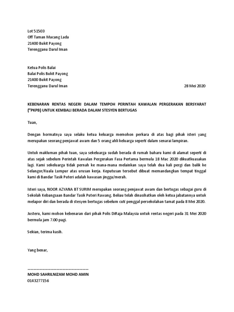 Surat Pkpb Polis / Pkpb Klang Tidak Perlu Kebenaran Polis Jika Ada Surat Majikan : Contoh surat kebenaran pelepasan bekerja muat turun borang permit pergerakan polis. terkini contoh surat rasmi kebenaran bekerja daripada majikan yang perlu ditunjukkan kepada polis/roadblock ketika pkp atau sekiranya tiada gunakan cop syarikat. Edisiviral majikan perlu sediakan surat bagi pekerja yang merentas negeri. Terkini empat pemuda melayu ditahan polis kuil maha mariamman. Borang kebenaran boleh dimuat turun di facebook polis diraja malaysia atau portal rasmi pdrm melalui pautan berikut surat untuk merentas, keluar , masuk negeri untuk pkpb. Kecuali pergerakan dari kabong ke saratok dan waktu boleh keluar rumah tetap tidak berubah semasa perintah kawalan pergerakan bersyarat (pkpb) tetap.
