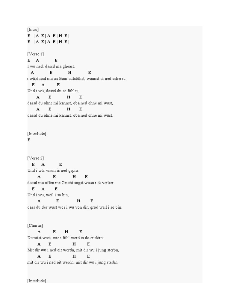E a e und i wü, dassd du so fühlst, a e b e dassd du ohne mi kannst, oba ned ohne mi wüst, a e b e dassd du ohne mi.